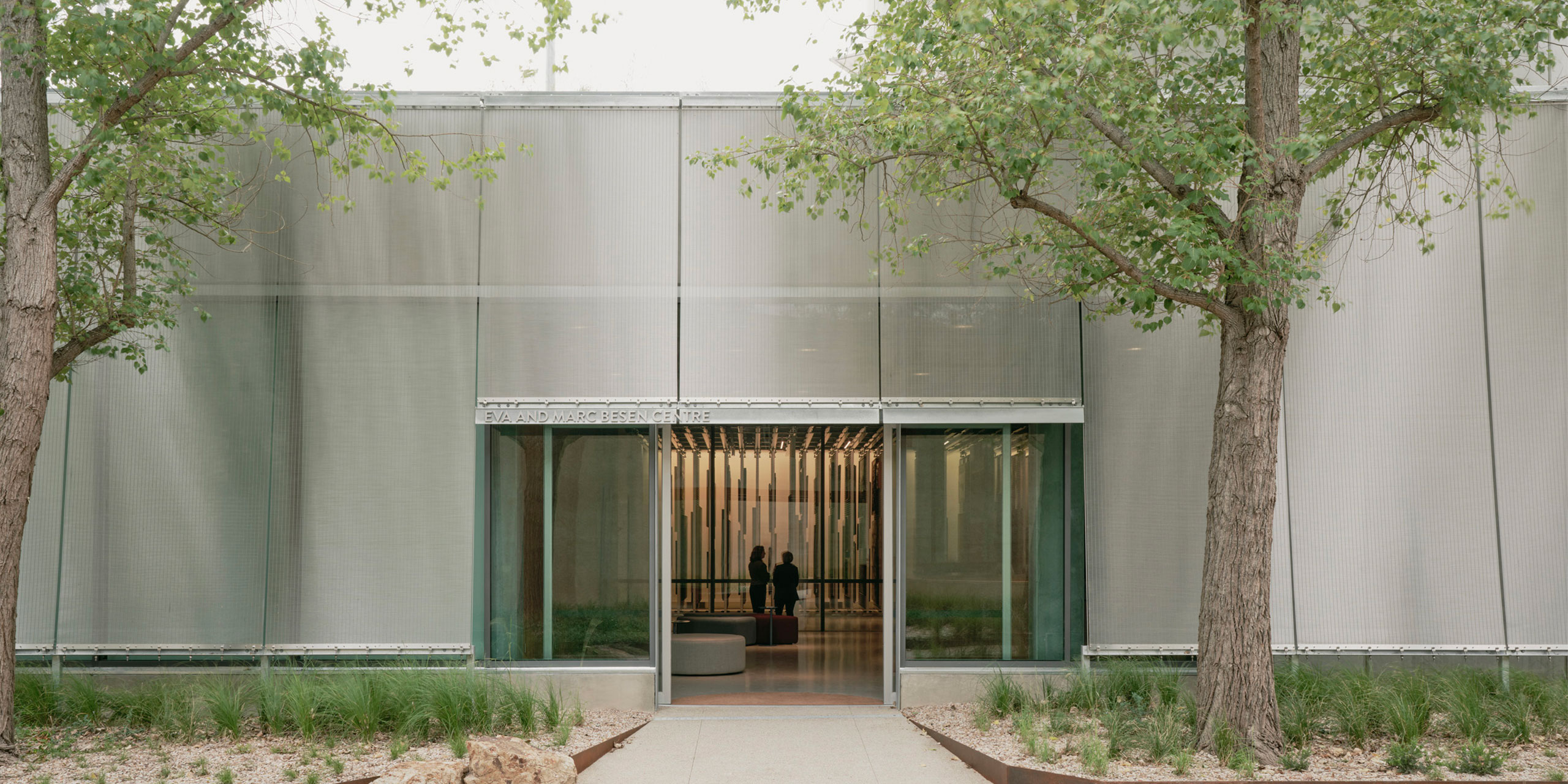 The design enhances the cultural precinct while sensitively integrating into the natural landscape and respecting the adjacent Museum of Art by Allan Powell. A low-lying form with a single glazed façade is wrapped in woven metal mesh, allowing the Centre to recede visually into the landscape while maintaining views and natural light. This subtle presence supports a strong visual connection between interior spaces and the surrounding terrain.