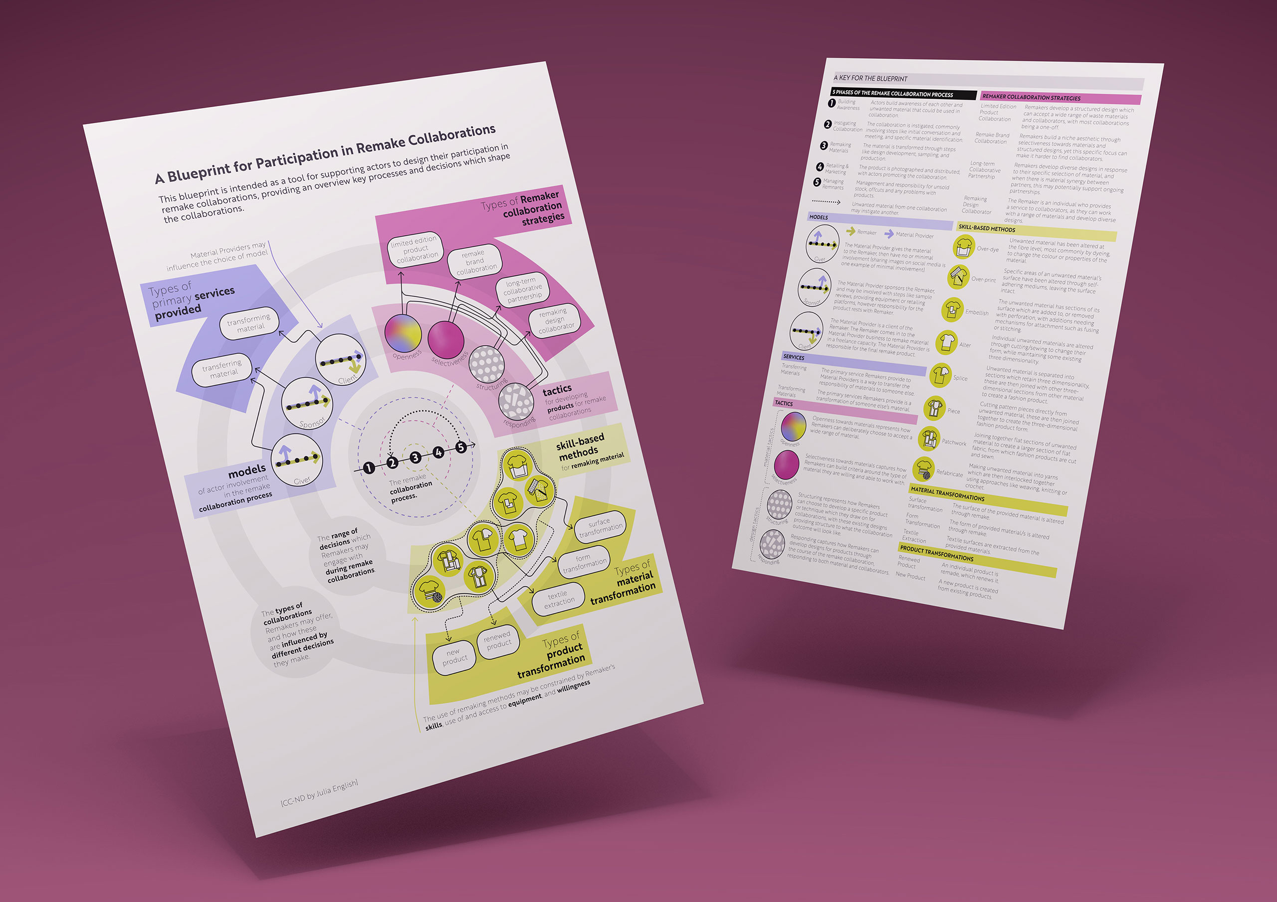 While based on existing practices, the blueprint goes beyond simply understanding how actors collaborate to remake textile waste, but rather translates these complex options into a guide for others, building symbols and language to help users communicate and navigate these practices.