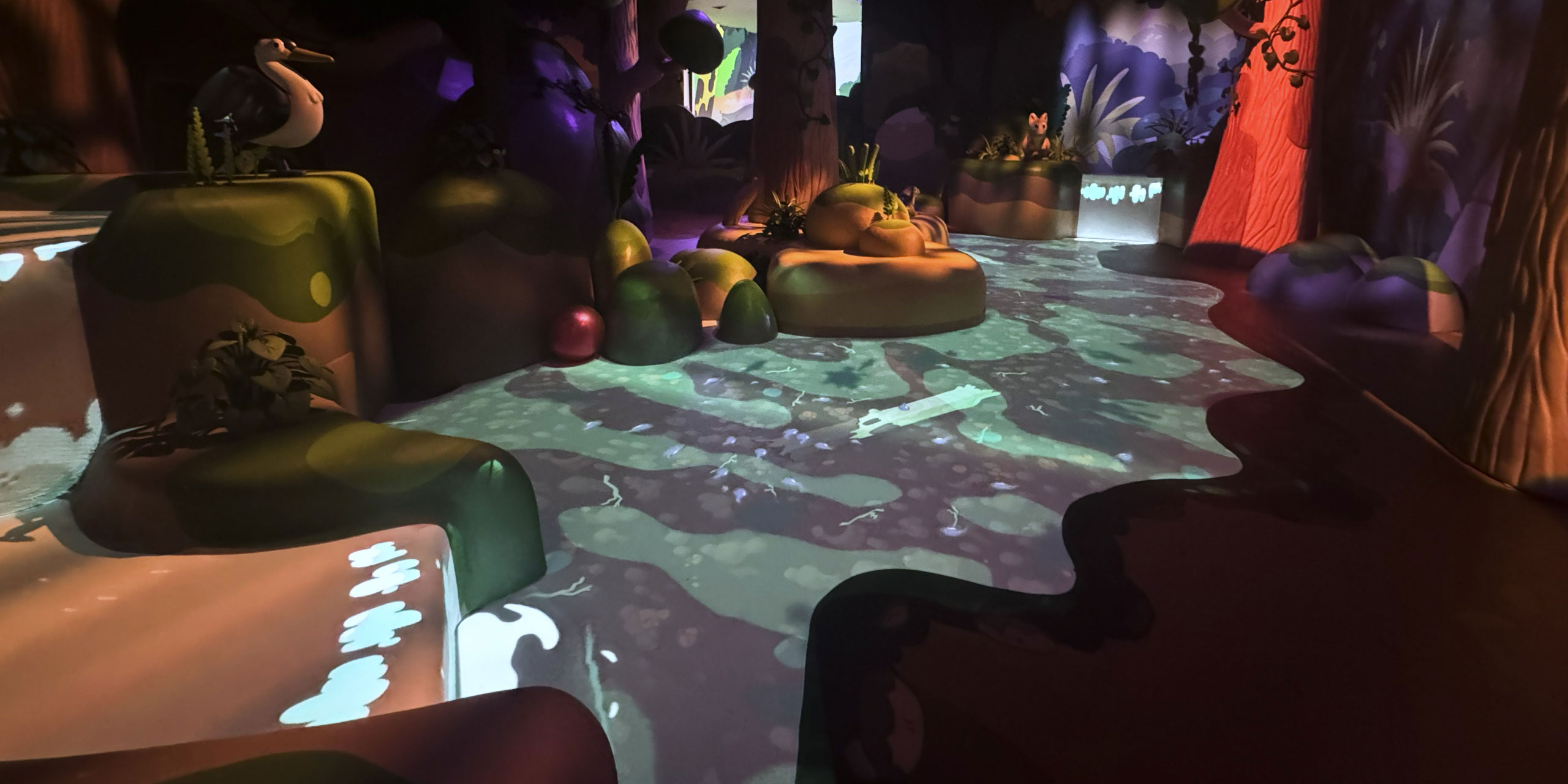 The final installation was commissioned onsite in Brisbane in October 2024. Set within a custom-built creek environment, it combined floor and wall projection mapping, ceiling-mounted motion sensors, audio, and responsive lighting. We thoroughly road-tested it with the crew, splashing around being chased by tadpoles, revealing creek creatures, making sure it worked and most importantly... was fun!