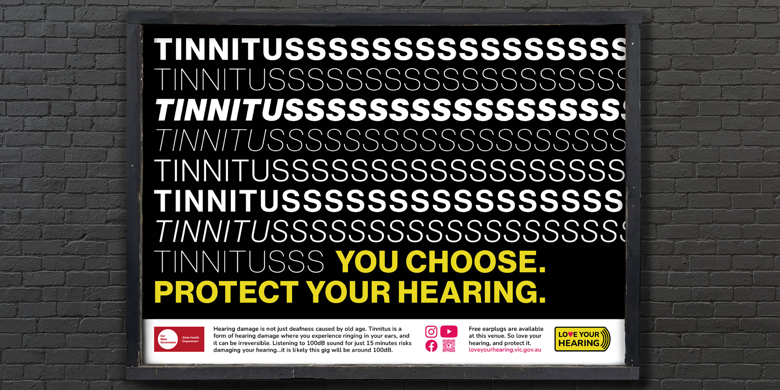 Extensive research provided the basis for creating personas representing the target audience. With these in mind, empathy was fostered and concepts were brainstormed. It was understood that music-attendees did not want to stand out from peers in using hearing protection. However, upon learning that when free earplugs were available, more music-attendees used them (Cha et al., 2015), it was considered that if earplug usage was commonplace in music culture, then the stigma around using hearing protection may fade. Therefore the idea to educate patrons about the negative outcomes of hearing damage through messaging at music venues, and offer an immediate solution—proposed free earplugs available at the venue—was devised. Through significant academic research and inventive visual messaging, the design met and exceeded the brief.