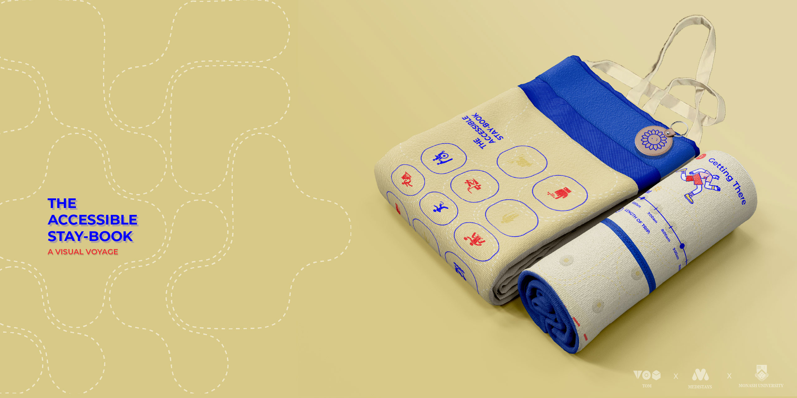 The design was prototyped across multiple iterations, with feedback gathered from MediStays staff, TOM representatives, and a family member of a team member with a hidden disability. This participatory testing resulted in critical refinements, broadening the tool’s applicability beyond STA to general travel and care journeys. The final outcome integrates a visual journey planner with reflective prompts, packaged within a durable, washable fabric tote bag. It allows users to pre-plan accommodation stays, carry essential items, and reflect on their experiences to build confidence and independence over time.